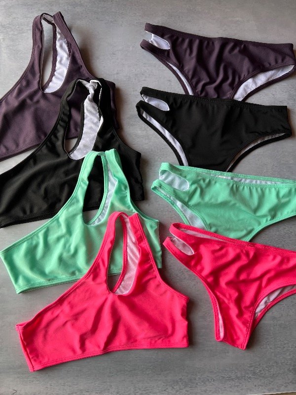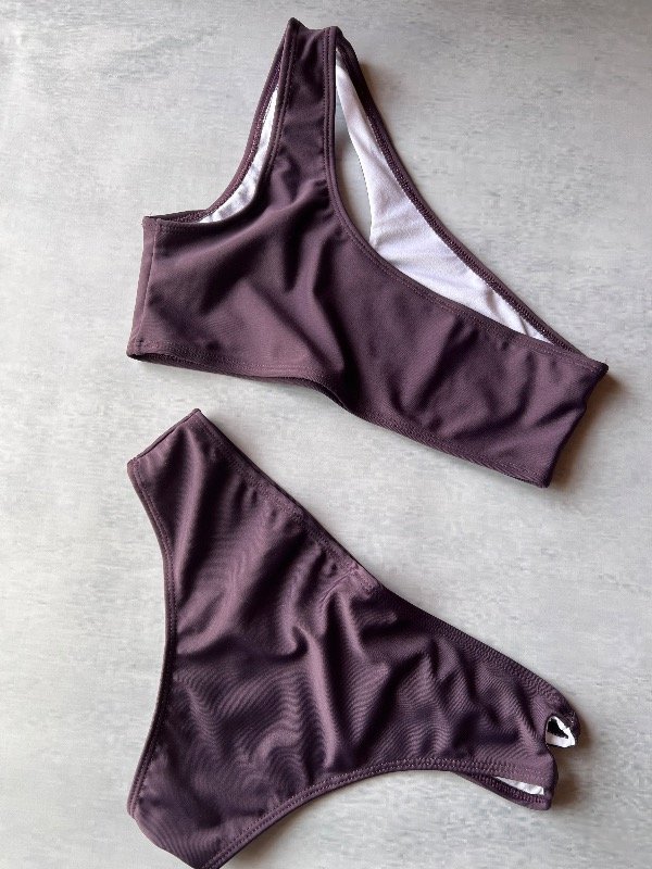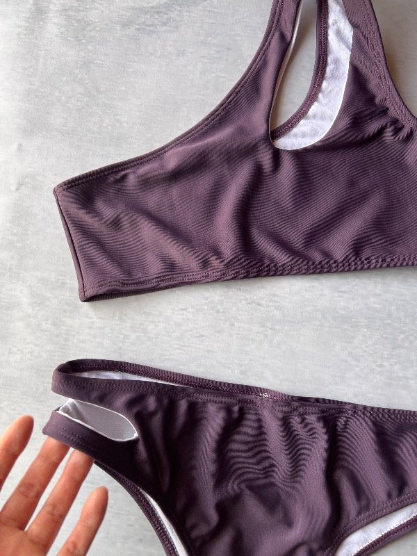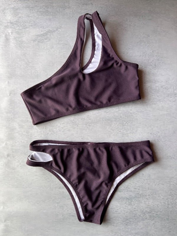 Conjunto de bikini, corpiño recto de un hombro con abertura, bombacha vedetina con recortes