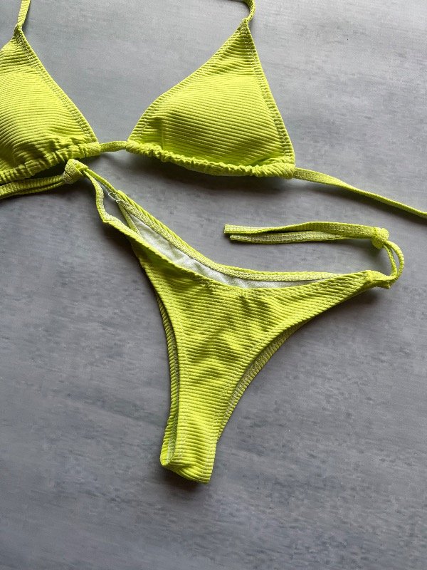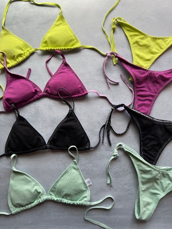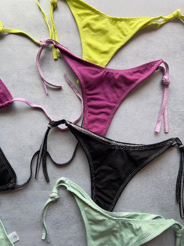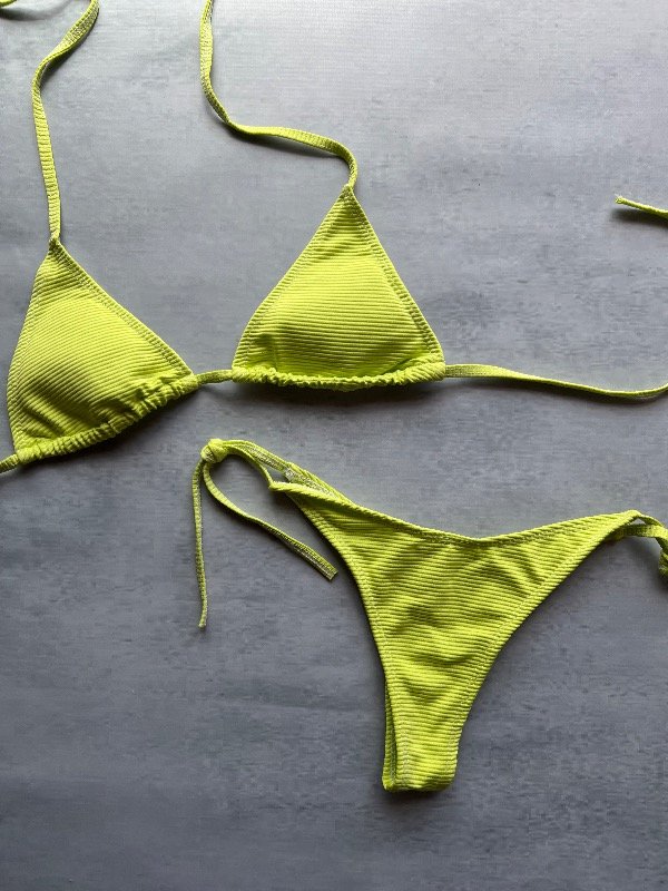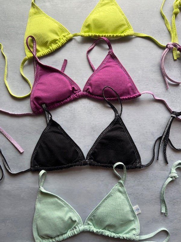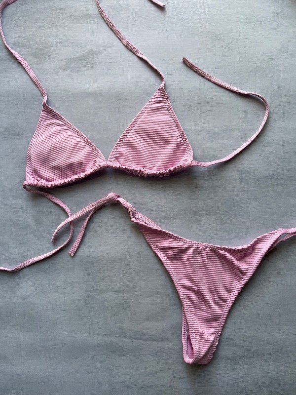 Conjunto de bikini, corpiño triángulo para atar y tasas desmontables, bombacha less para atar (costuras blancas)